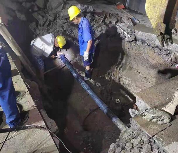DN600管徑是襄城輸配水主管線,炎熱夏季正值用水高峰,閘門一旦關停就會造成大面積用戶停水。由于該地段有3個不同高度的地平面,而漏點又在停車場內,地形錯綜復雜不利于大型設備開挖??阂嘬姷葲]有等待,與商都負責人郭洪取得聯(lián)系一起協(xié)調車輛疏散,核實最佳地點開挖面積長15*2米,于晚22:15用水峰值下來后立即停水維修DN600開口夾板,于15日0:15分完成搶修開水,2:00完成回填維修完畢。