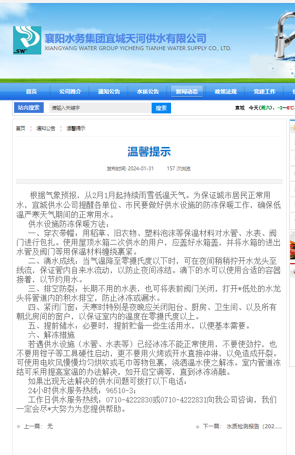 近日,我市出現(xiàn)強降雪天氣,極端低溫天氣易造成供水管網(wǎng)、水表、水龍頭等設(shè)施的凍損,影響市民用水安全。為保障全市供水安全穩(wěn)定,宜城天河供水公司堅持提前部署、預防為主、及時搶修原則,扎實做好寒潮及春節(jié)期間保障供水的防御和應(yīng)對措施準備。
